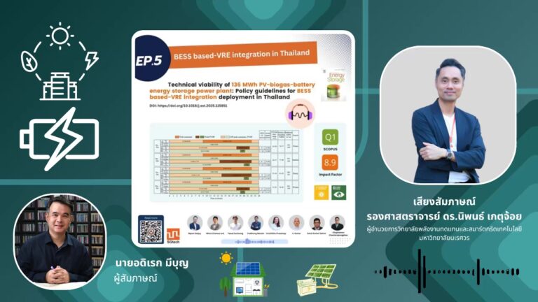 Under the research topic “Technical viability of 136 MWh PV-biogas-battery energy storage power plant: Policy guidelines for BESS based-VRE integration deployment in Thailand” this episode features an interview with Assoc.Prof.Dr.Ing.Nipon Ketjoy, Director of SGtech. The interview was conducted by Mr. Adirek Meeboon, Public Relations Officer, Public Relations Division, Central Administration Office, Office of the President, Naresuan University.